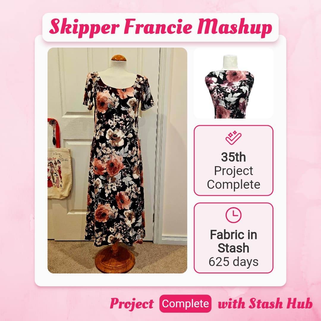 I won this fabric at a Frocktails event. It is gorgeous fabric but not quite my colours. One day I convinced myself it WAS my colours and completed this Francie Skirt, Skipper Bodice mashup from Charm Patterns by Gertie. My conclusion is that the fabric doesn’t suit me but it does suit Dolores, my dressmaker’s dummy. She’s enjoying wearing it.