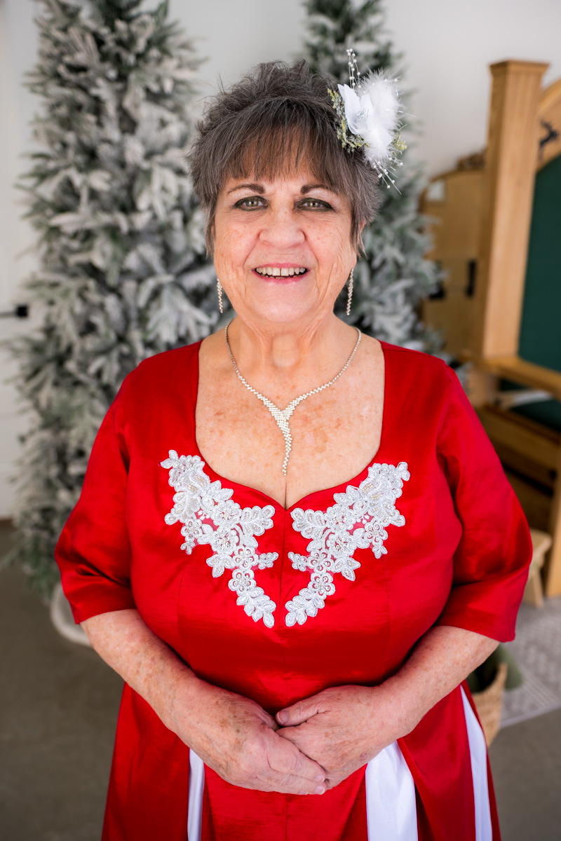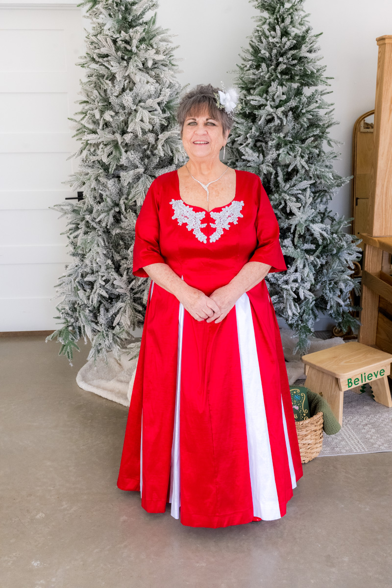 My latest completed project is one my Mom hired me to make for her. My father is a professional real-bearded Santa Claus, and my Mom joins him as his Mrs. Claus. She typically wears the “in the kitchen” style dress and pinafore I made for her a couple years ago. But my stepdaughter requested that my Dad wear his red tuxedo to her wedding in February, so Mom needed a formal-style dress, and it turns out they were hired to work a wedding this December, so she needed to expand her Mrs. Claus wardrobe anyway.