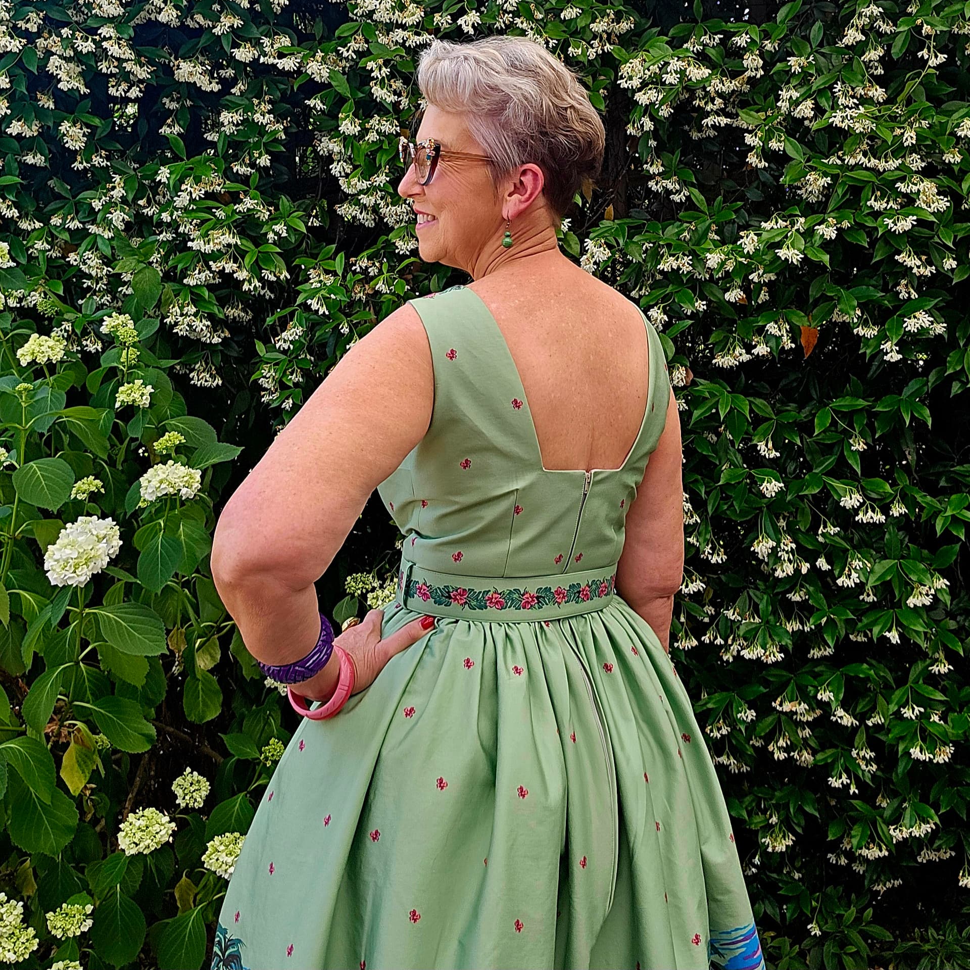This dress really features the belt, and I had in my stash the perfect green belt buckle purchased from Mood New York in 2011. I cut the fabric to feature the floral border along the length of the belt.