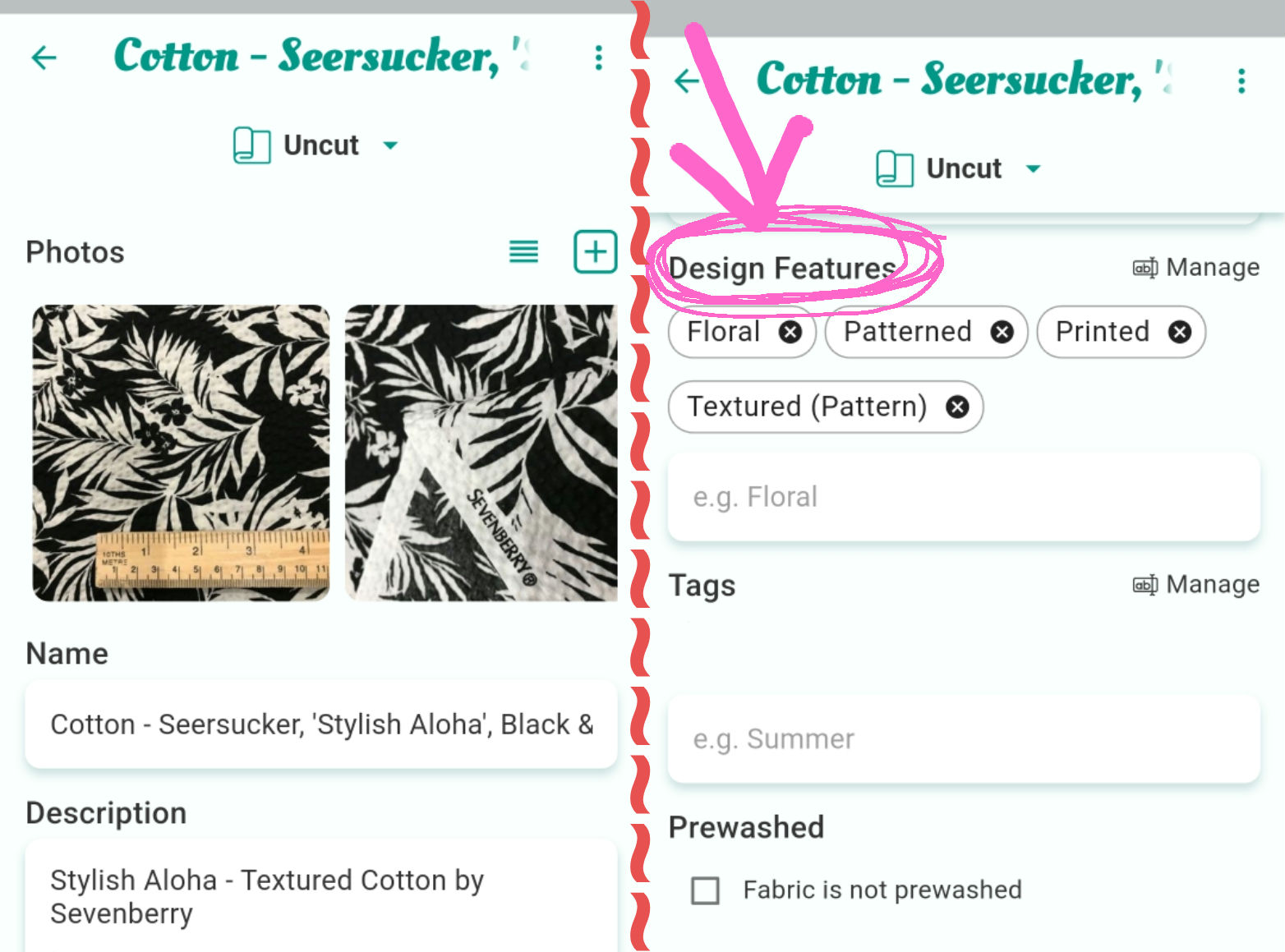 @Annieclick I personally use the Design Features within Fabrics to add whether a fabric is…