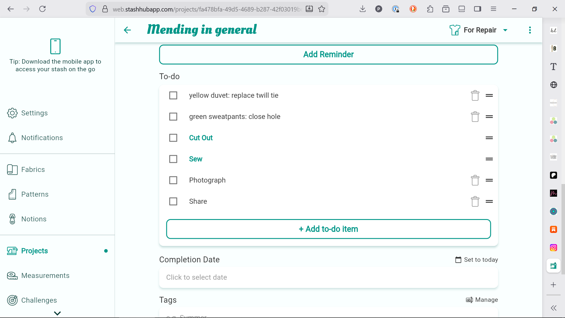 I think that’s a great idea to have a general project for repairs. I’ve got a similar one called Black Thread project - repairs, take up a couple of trousers, hem a tablecloth etc - so when I have everything threaded up in black (a very rare event in my sewing room), I don’t forget them all.