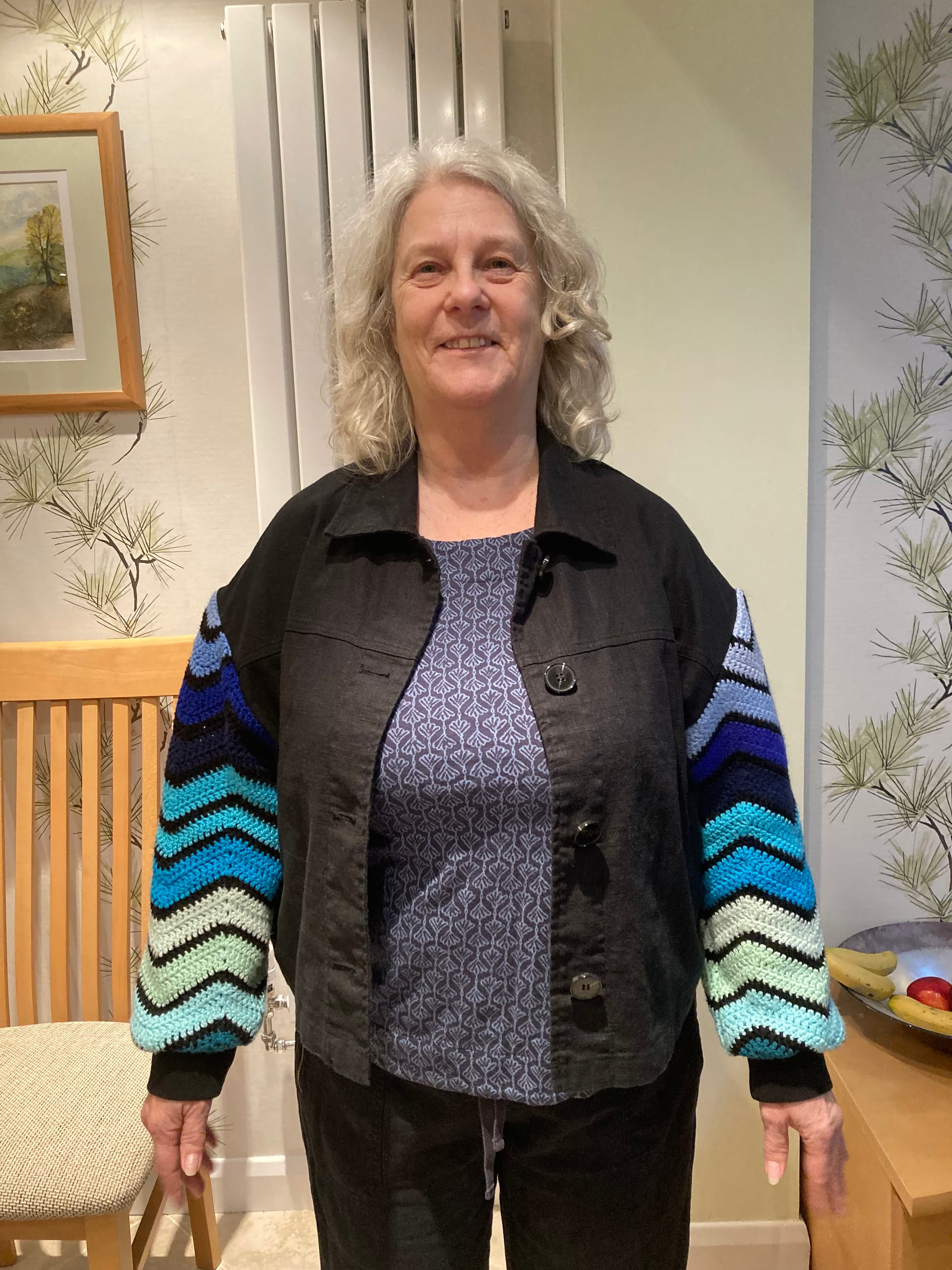 The crochet blanket was a charity buy and the cuffs upcycled from a sweatshirt.