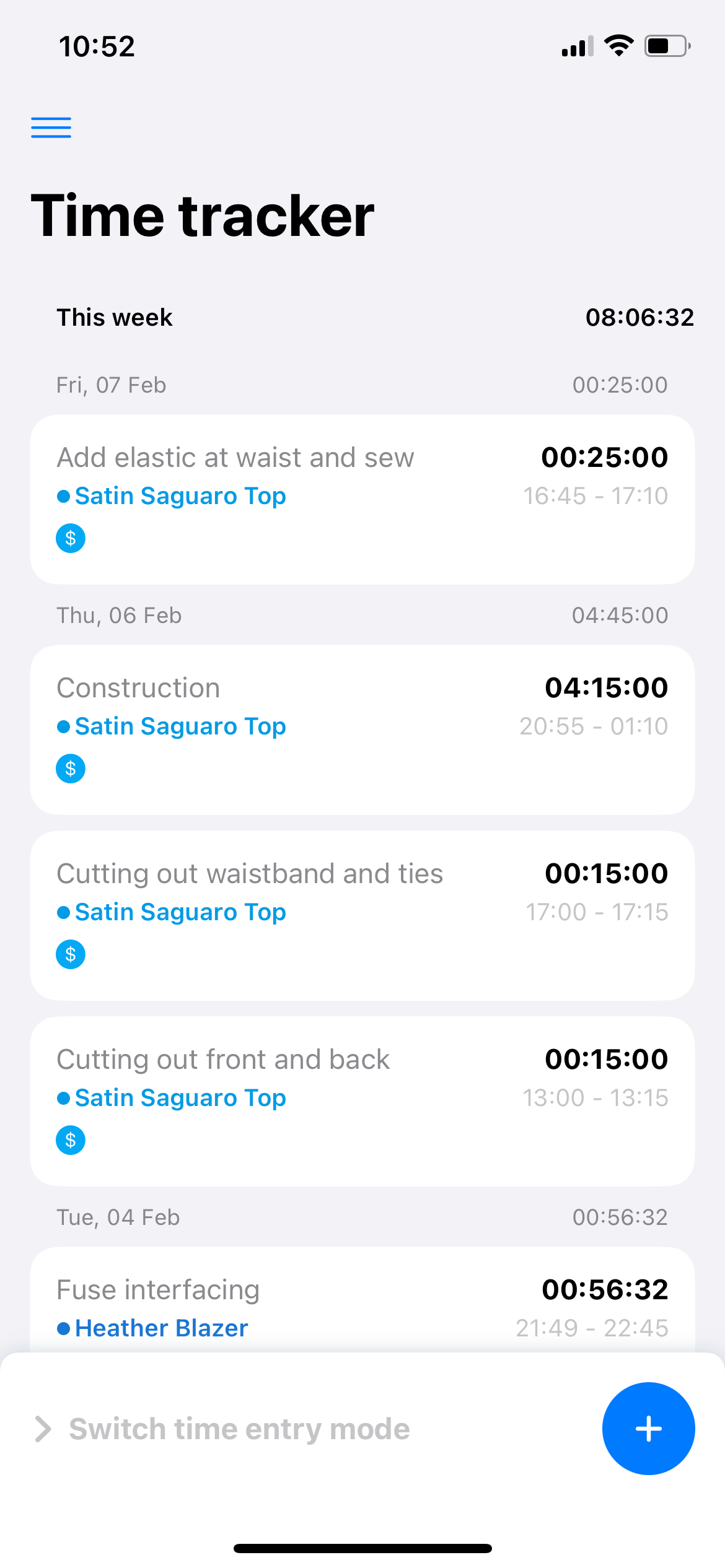 I like to log how long I spend on a project for all of the different stages, and have a total for each project. I currently use Clockify to record each sewing session.