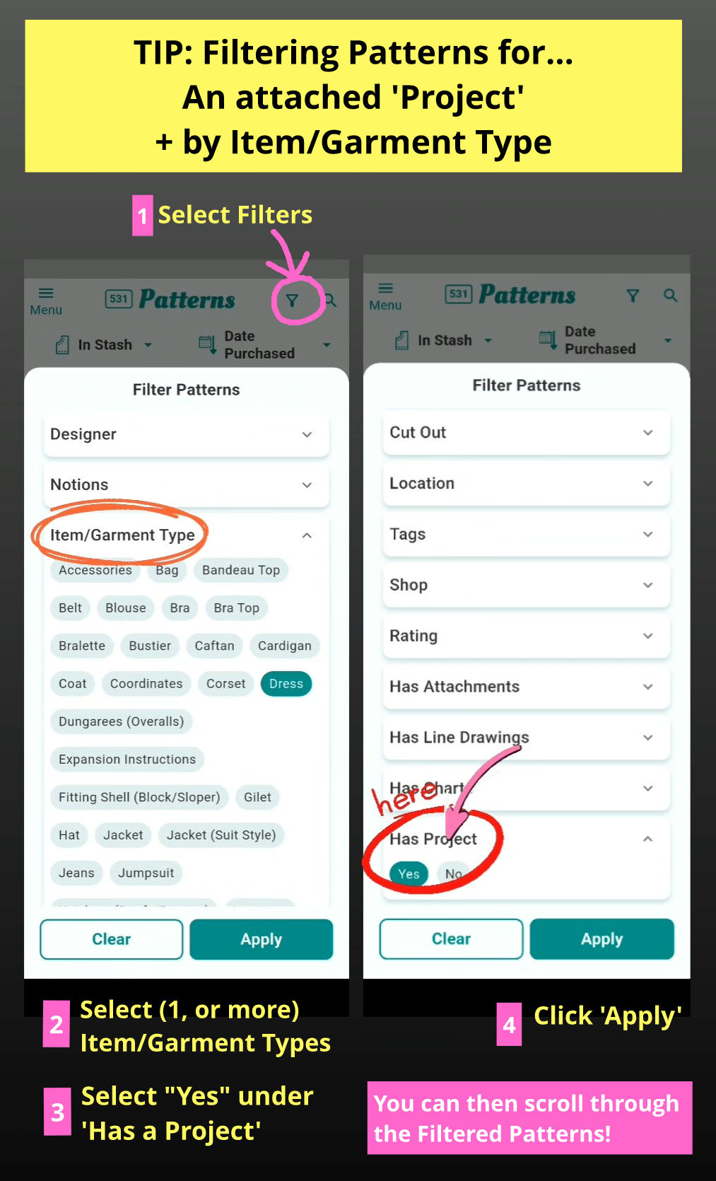 Further to my other TIP here where I describe How I use Tags to Filter my PROJECTS 📲, and further to a comment in that post by @Donnas_sewing_room I’m sharing below how to filter your patterns to view which ones have a Project attached to them and also to narrow down that further by the item/garment type too