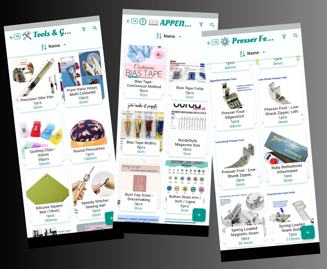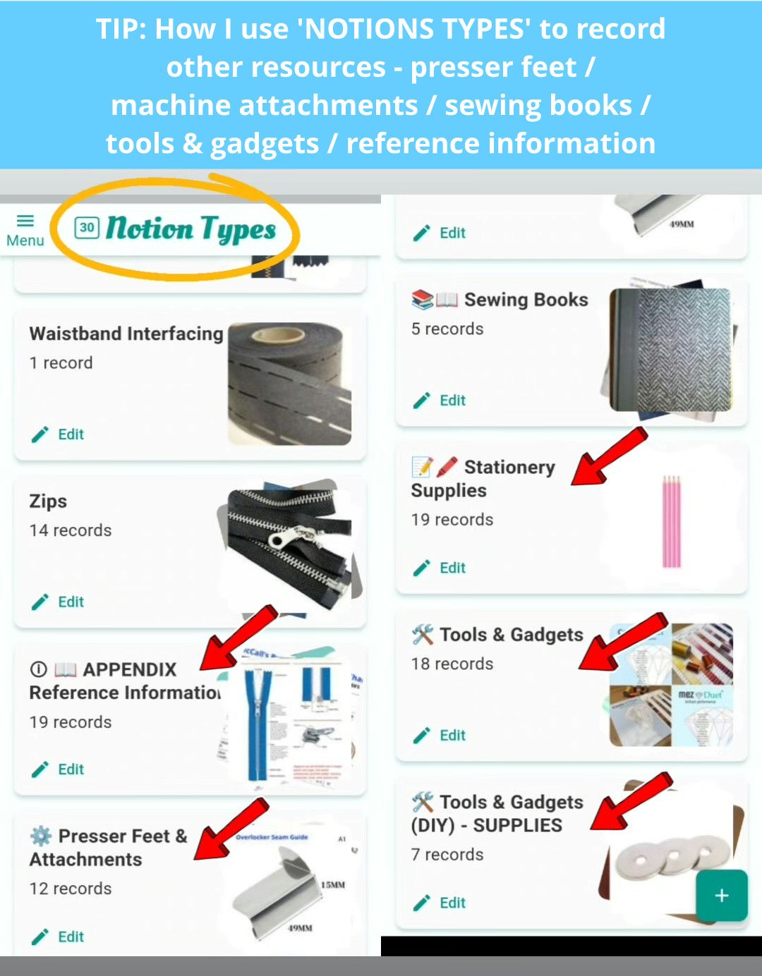 In the absence of an official dedicated “Tool / Resource” area of the app - the “Notions” area is where I choose to record information about things like presser feet / machine attachments / sewing books / tools & gadgets / reference information.