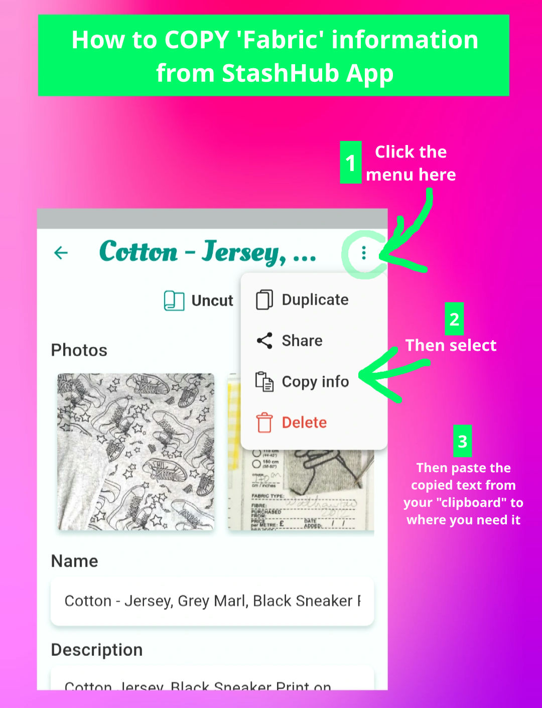 Donna you were asking in General Chat about how to copy information from StashHub app to help you when destashing/selling fabric
