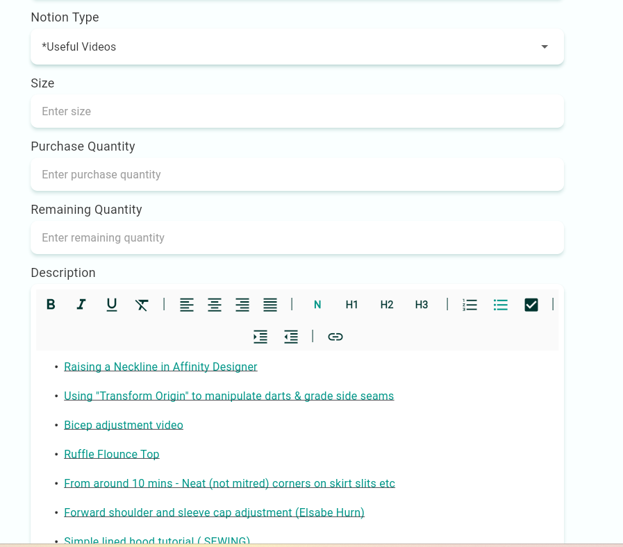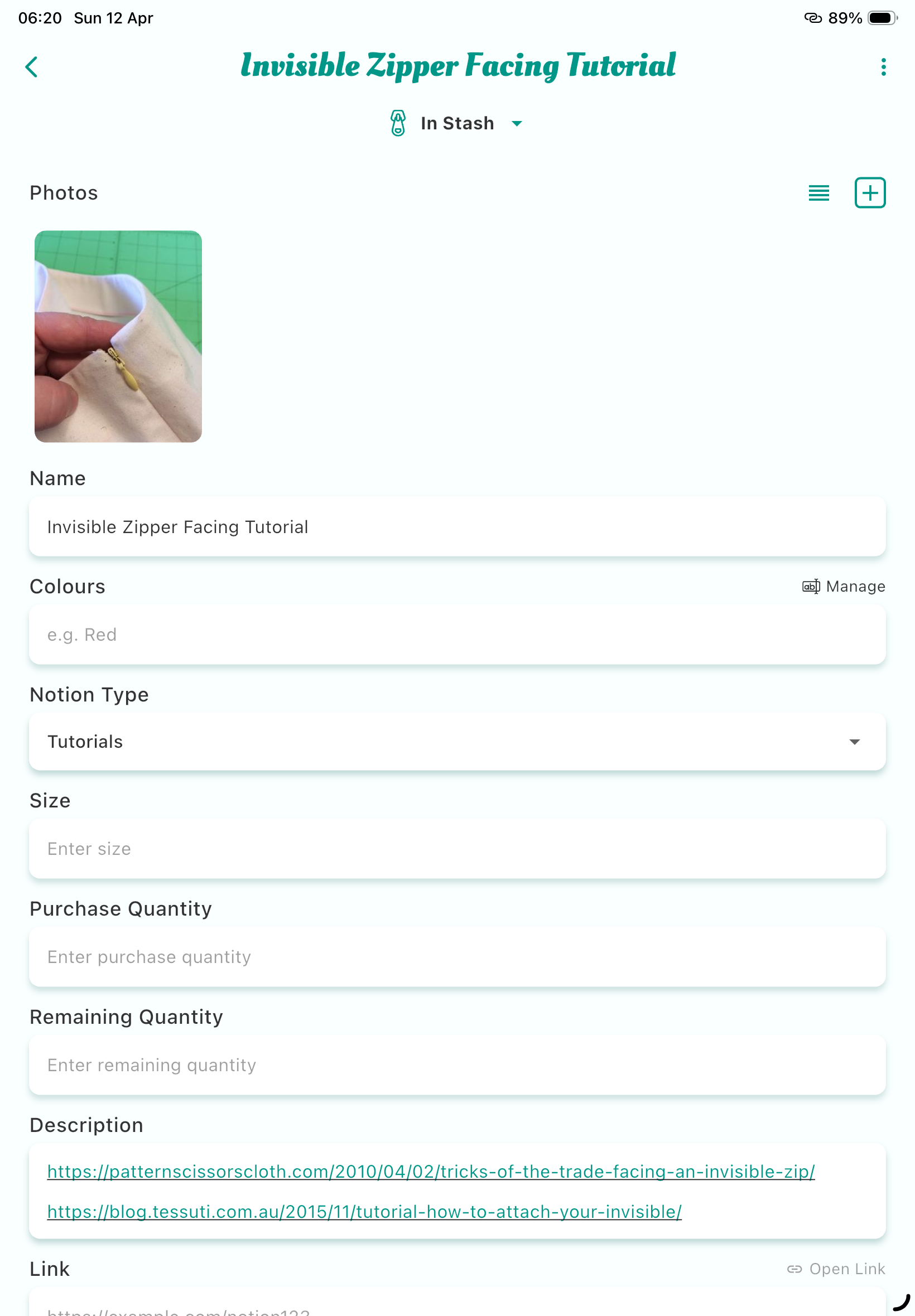 I was watching part of a course (unrelated to sewing) when Youtube suggested a really useful video on how to do facings without serging. I immediately copied the URL and went to put it in Stash Hub so I could find it again. But I ended up putting it in the notes for the next project that has facings, because I couldn’t think of a more general place to put it. Would this be a useful feature? - a place to put links to instructional videos or notes on general sewing tips that don’t necessarily relate to a specific pattern or project?
