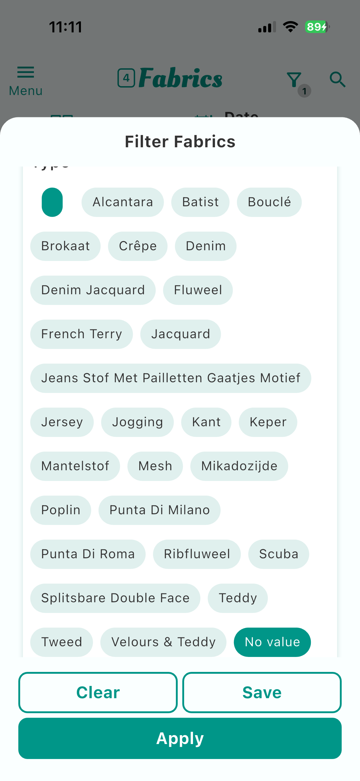 In the filter, two different values appear for the same thing under ‘Type of fabric’: a space and no value.