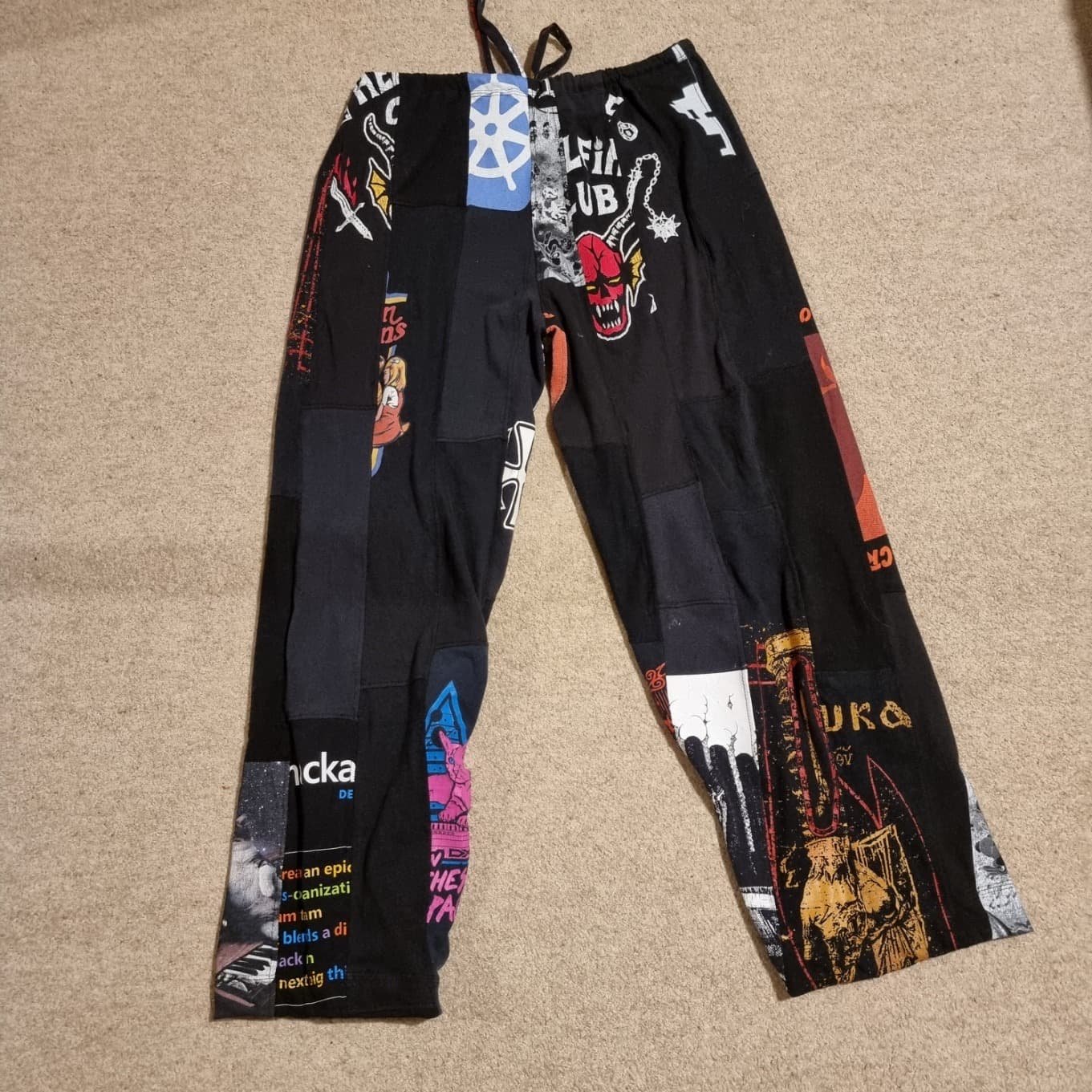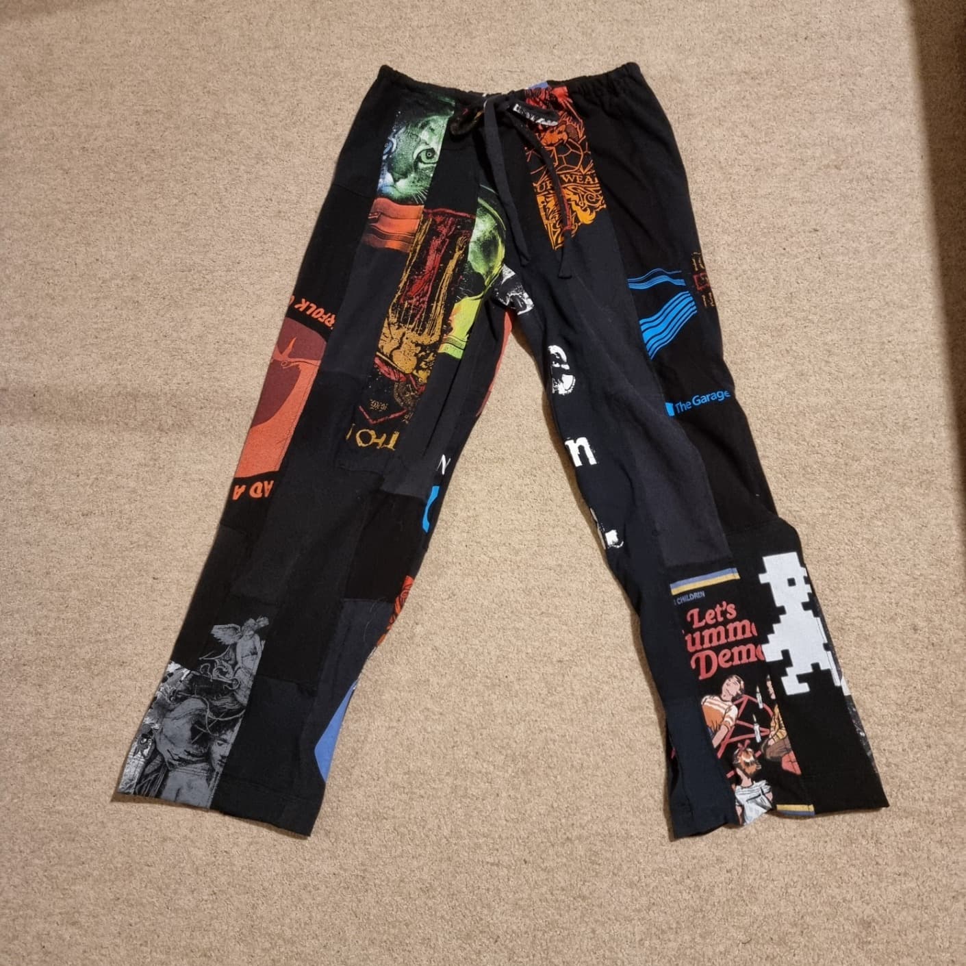 TShirts were cut into 10cm strips, overlocked together then the overlocked seam stitched flat with a stretch stitch so it was smooth inside. Used an old Simplicity PJ bottoms pattern.